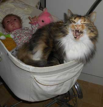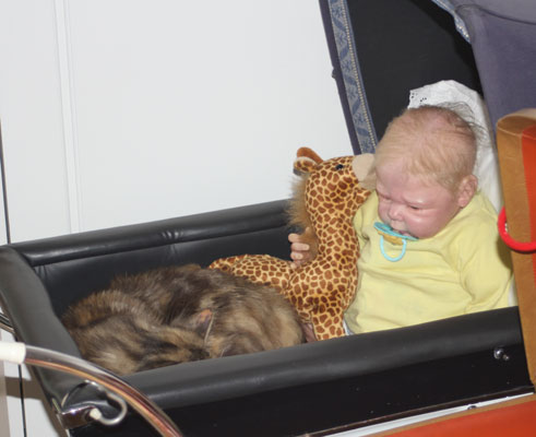 2017-11-11 Nu har Tussan sluppit "kragen" och plåstret är borta. Hon kan göra vad hon vill och har lagt sig hos reborndockan Nino, i en liten dockvagn.