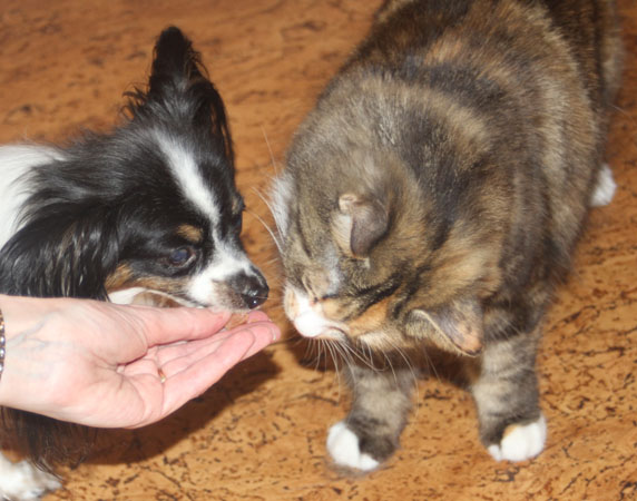 2017-08-19 Matte bjuder på "blötmat", när det är lördag. "Lax i sås". Men Cilla är också intresserad, att lukta. Men med egen matbänk kan Tussan äta gott i lugn och ro.