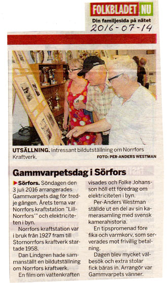 2016-07-03 Gammvarpets dag 2016. Årets tema var "Elektriciteten i byn", med bl.a en bildutställning om Norrfors Kraftverk, (Lill-Norrfors), sammanställd av Dan Lindgren. En film om vattenkraft visades och Folke Johansson höll ett föredrag om elektriciteten i byn. Per-Anders Westman ställde ut en del av sin kamerasamling med svensk kamerahistoria. Fika och varmkorv serverades mot frivillig betalning. Dagen blev mycket välbesökt. Stig måste bära in flera stolar!!