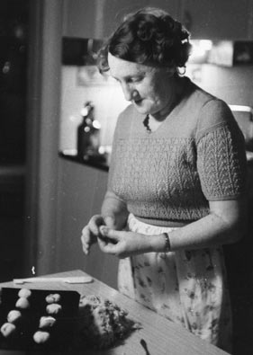 I hennes hem i Norrfors bjöd hon gärna hem sina vänner till väl lagade och väl tllltagna middagar. Vid dessa tillfällen hade hon dubbla förkläden. Så länge som hon var i köket hade hon ett förkläde utanpå det vita, välstrukna och innan hon gick in till gästerna så tog hon snabbt av sig skyddsförklädet och var då ren och snygg vid serveringen.