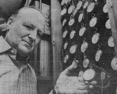 Till en av de mera planlagda förvärven hör klocksamlingen. Den består av över 60 ur. De flesta från tidigt 1800-tal, en tid då England var stor klocktillverkare-nation. Den äldsta klockan är tillverkad av John Ward i London, år 1780. Men den är troligen inte den mest sällsynta i samlingen. Det är säkerligen en klocka med inbyggt slagverk som sprider sina toner för såväl kvartar som timmar. Klockan i handen på bilden är inte lika gammal - men orginell. Snodden är nämligen tillverkad av hår från en människa. Dessutom finns ett antal armbandsur, bordsur, pipor, gamla mynt och sedlar m.m i samlingen.