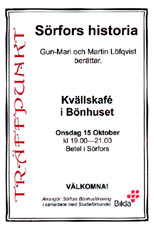 2014-10-15. Kvällskafé i Bönhuset Betel. Denna onsdag i oktober, hade Gun-Mari & Martin Löfqvist, arrangerat en mycket välbesökt och uppskattad träff, där de kunde berättade mycket om Sörfors historia. Bland de besökande fanns, både nya och gamla, intresserade sörforsbor. Ett stort tack till Gun-Mari & Martin.