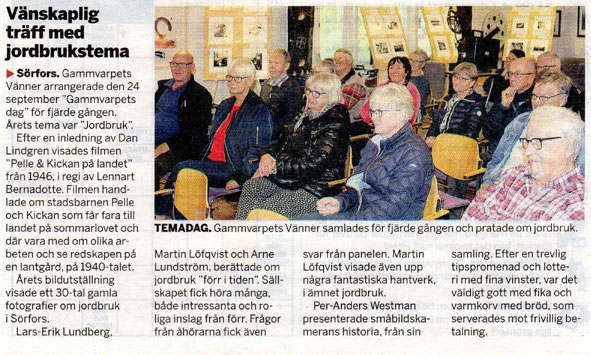 2017-09-24 Gammvarpets dag 2017. Årets tema var "Jordbruk". Efter en inledning av Dan Lindgren visades filmen "Pelle & Kickan på landet" från 1946, i regi av Lennart Bernadotte. En film om stadsbarnen Pelle och Kickan som får fara till landet på sommarlovet och där vara med om olika arbetena och se redskapen på en lantgård under 1940/50-talet. De får även leka och sköta gårdens alla djur.