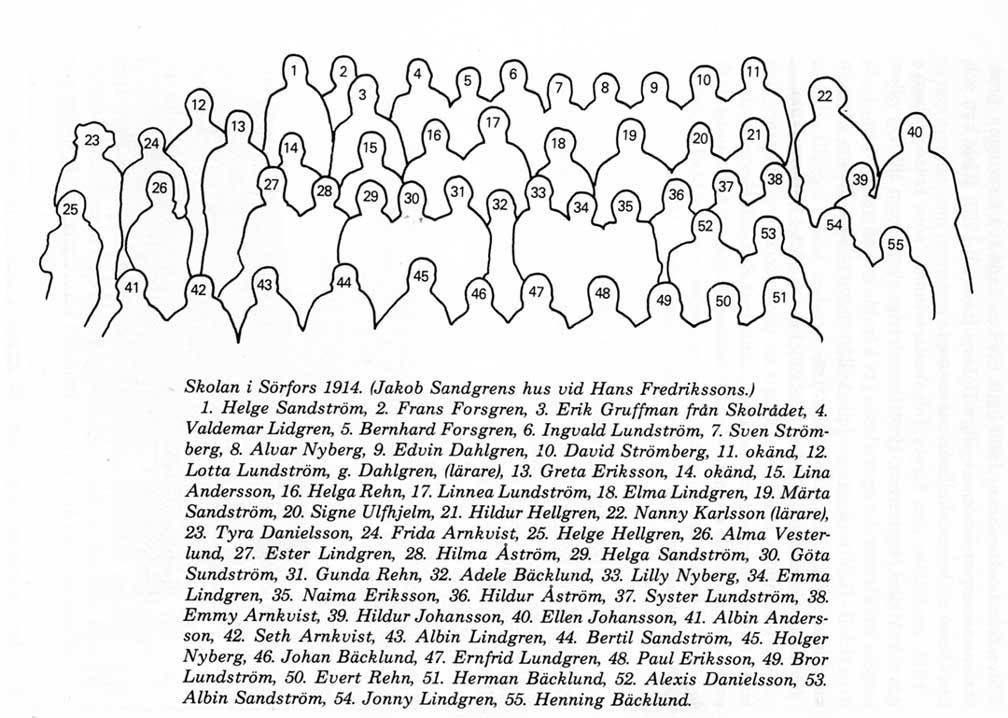 När vi kom till Sörfors i oktober 1919 hade skolan för året redan börjat. Trots att jag inte fyllt åtta år hade jag gått mina två år i småskolan och skulle egentligen börja tredje året som hölls i Ordenshuset. Småskolan var i vårt hus och det skulle ju bli bra att gå om andra klass. Hilma Nordström, senare Forsgren, var lärare och bodde i kammaren bredvid skolsalen. Vi fick klara oss med köket och ett rum på vinden. Det blev så många nya seder och upplevelser för en åttaåring.