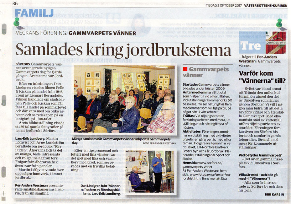2016-07-03 Gammvarpets dag 2016. Årets tema var "Elektriciteten i byn", med bl.a en bildutställning om Norrfors Kraftverk, (Lill-Norrfors), sammanställd av Dan Lindgren. En film om vattenkraft visades och Folke Johansson höll ett föredrag om elektriciteten i byn. Per-Anders Westman ställde ut en del av sin kamerasamling med svensk kamerahistoria. Fika och varmkorv serverades mot frivillig betalning. Dagen blev mycket välbesökt. Stig måste bära in flera stolar!!