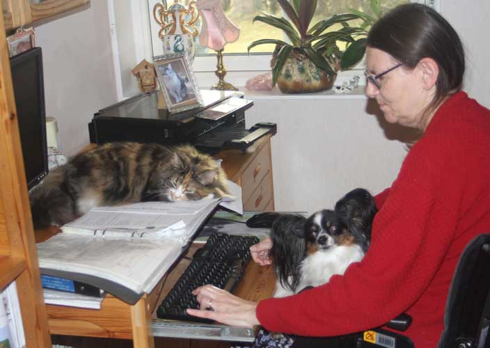 2018-10-17 Matte vid sitt databord med Tussan och Cilla.