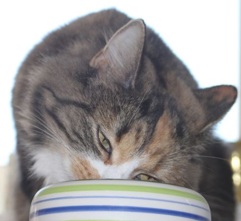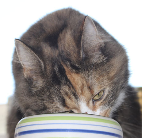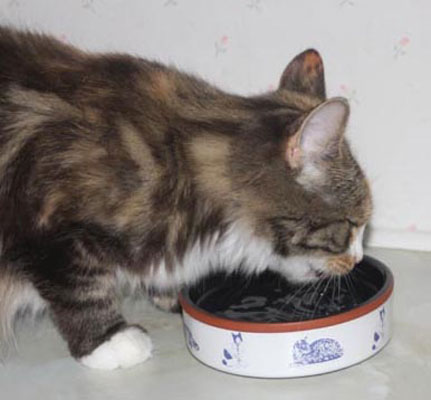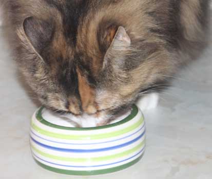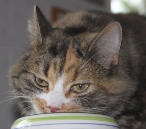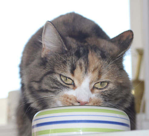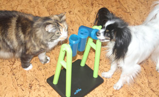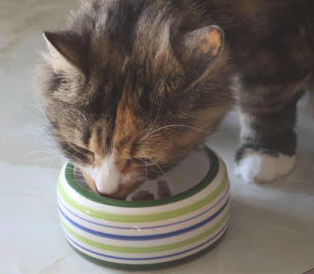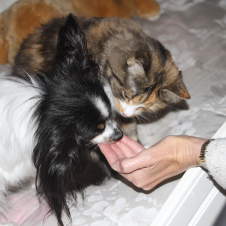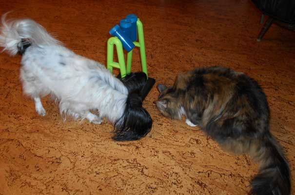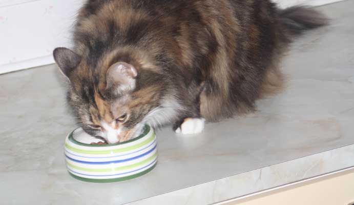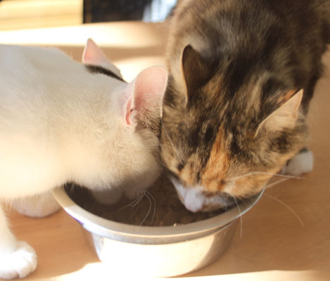2017-08-19 Matte bjuder på "blötmat", när det är lördag. "Lax i sås". Men Cilla är också intresserad, att lukta. Men med egen matbänk kan Tussan äta gott i lugn och ro.