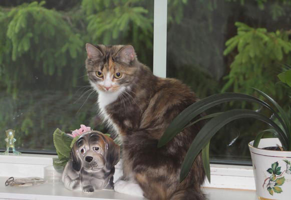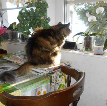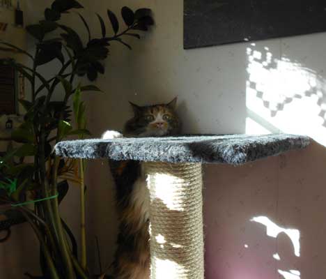 Hon har en egen bänk med mat- och vatten-skålar. Och utsikt genom "eget" fönster.