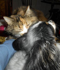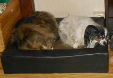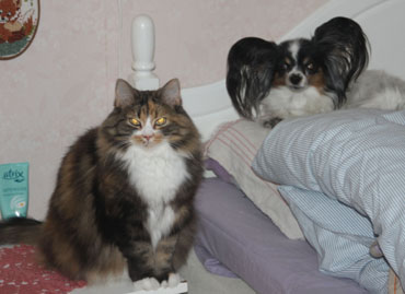 2017-08-22 Tussan och Cilla i mattes knä och Tussan på vår säng