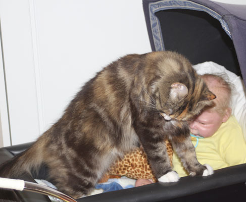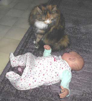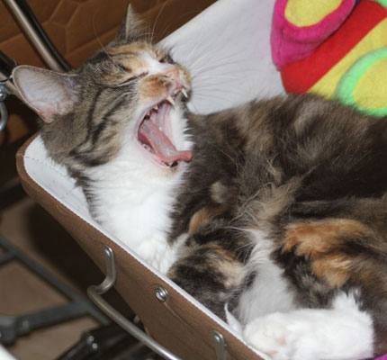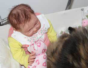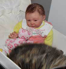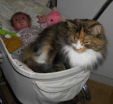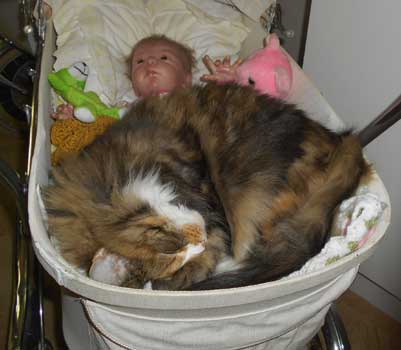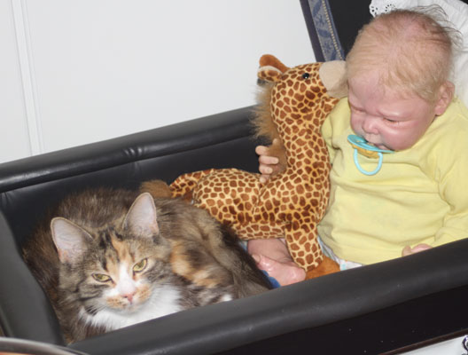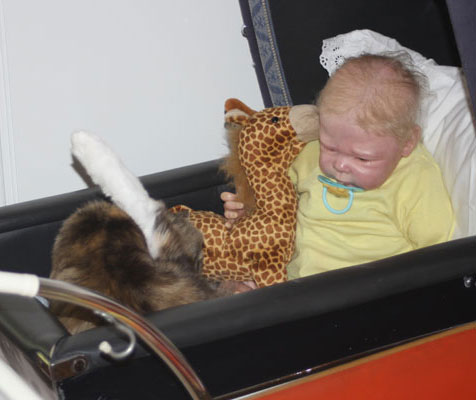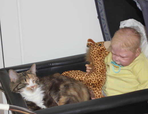 2017-11-11 Nu har Tussan sluppit "kragen" och plåstret är borta. Hon kan göra vad hon vill och har lagt sig hos reborndockan Nino, i en liten dockvagn.