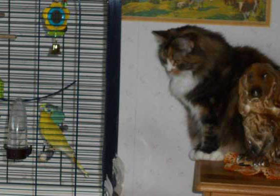 Tussan tittar på undulaterna, Eskil och Lalla, 2020-03-28