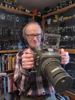 Många av dessa fabrikers kameramodeller finns i hans ägo. Förutom många modeller av den världsberömda Hasselbladkameran har Per-Anders även den första kameran från denna fabrik. Det är en flygkamera som är närmare fem kilo tung med namnet Flyghandkamera HK 7 med negativformat 7x9 cm. (Bild 2.)